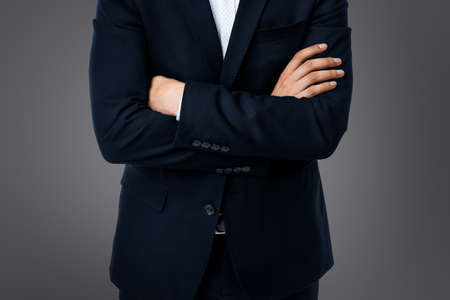 Torso of a businessman standing with folded arms in a classic black suit, depicting confidence and authority.