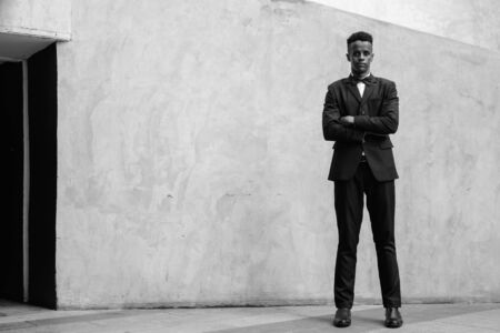 Full length portrait of African businessman wearing suit and tie outdoors in city while standing