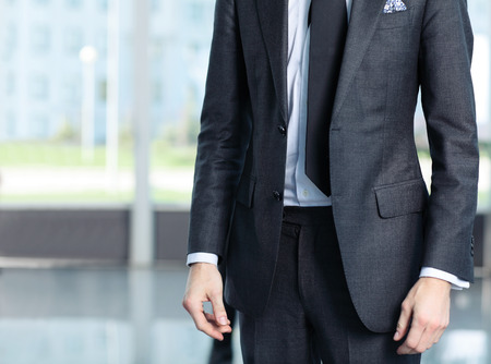 Close up of young businessman touching his black suit