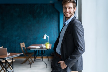 Confident professional handsome businessman standing near window in his office