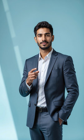A South Asian male tech leader in a modern gray jacket, exuding leadership as futuristic projections of data-driven success