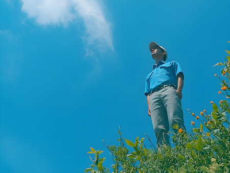 Photo - Man Gazing at Sky, Nature, Clouds, Summer, Blue, Green, Yellow Flowers, Outdoors, Hat, Plants