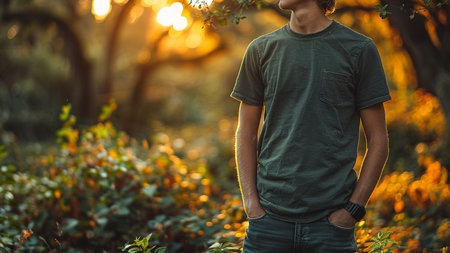 Standing amidst lush greenery, a hiker gazes upward, dwarfed by towering trees. Sunlight filters through the canopy, illuminating the vibrant foliage and creating an atmosphere of adventure.