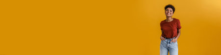 Happy casually dressed young african woman standing over yellow wall background, looking at camera