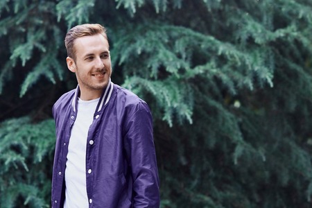 Smiling tall blond man in a corduroy brown jacket on a background of green leaves with backlight.