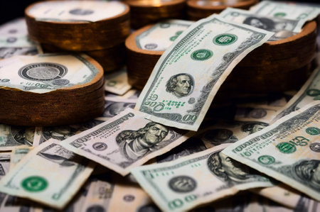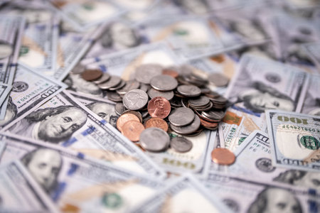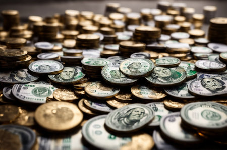 Close-Up of American Coins and Dollar Bills Concept of Finance, Currency, and Savings