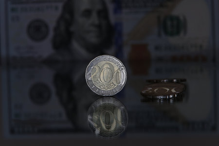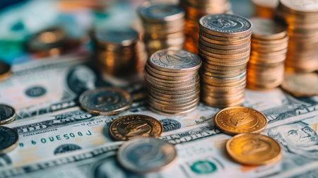 Stacks of gold and silver coins placed on top of various currency bills, symbolizing wealth, finance, and economic growth in a close-up view.