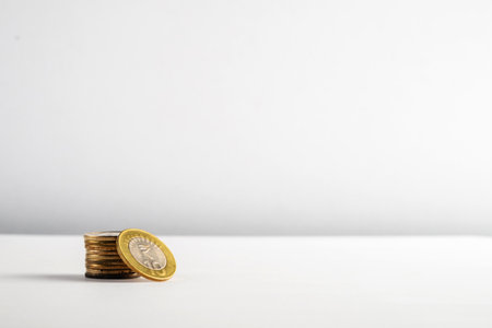 A neat stack of gold coins displayed on a plain white surface, symbolizing financial concepts like savings, investments, and currency. This minimalist composition portrays simplicity and monetary values.