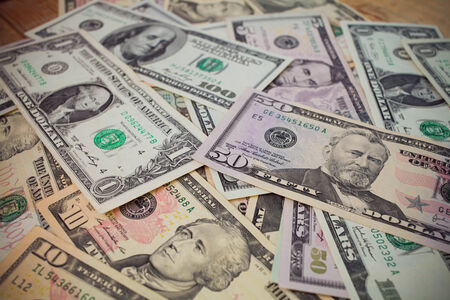 Selective focus money banknotes US dollar and coins on background put on wooden table, vintage style. Concepts of currency for saving, earning and payment, invesment fund, accounting and financial.