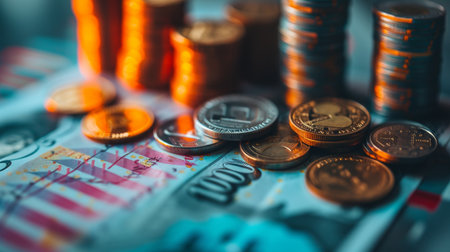 Explore the essence of economic growth and smart investment strategies with this visual depiction of coins and detailed financial graphs, symbolizing prosperity and planning.