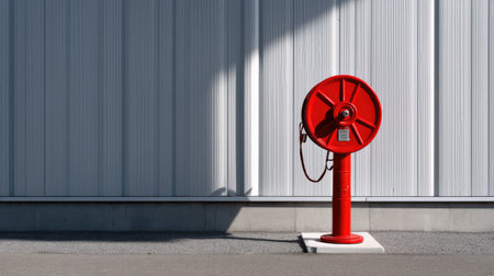 A vibrant red fire hose reel stands prominently against a textured gray wall, highlighting its importance in emergency preparedness and safety measures.