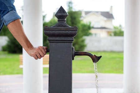 Man hand opening tap on drinking column, jet of water. Сity water tap with drinkable water in park. Ancient column for distribution of drinking water installed on street. Watertap on hydrant.