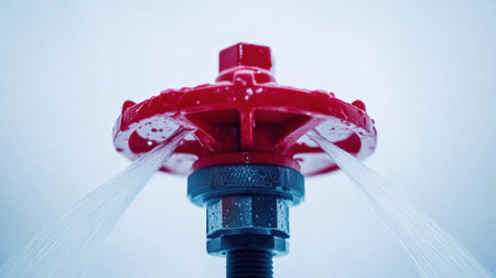 A vibrant close-up of a red fire hydrant valve with water flowing, showcasing essential emergency equipment against a soft blue backdrop, ideal for safety and plumbing themes.
