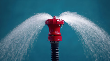 A striking red fire hydrant sprays water in two dynamic streams against a solid teal background. Perfect for themes of urban safety, firefighting, and emergency preparedness.