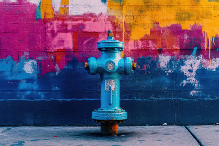 A vintage blue fire hydrant stands against a vibrant wall covered in colorful street art. The bright hues create a striking visual contrast, enhancing the urban atmosphere.