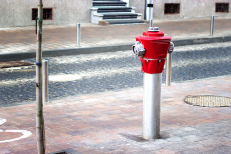 fire hydrant red white protection of the city on a background of gray tiles urban design