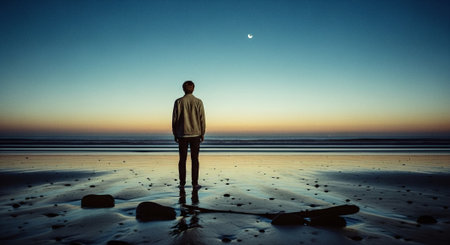 A person stands facing a soft glowing horizon during sunset, observing the colors of the sky and lost in thought.
