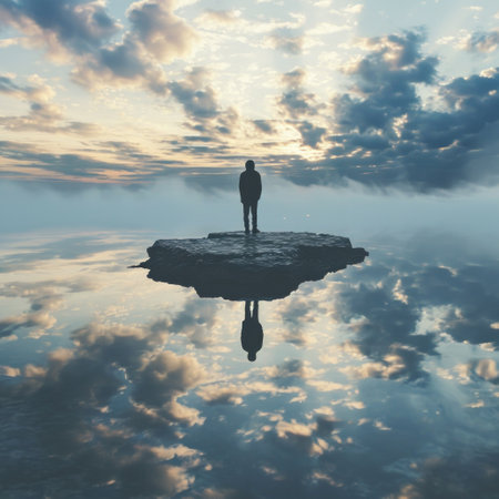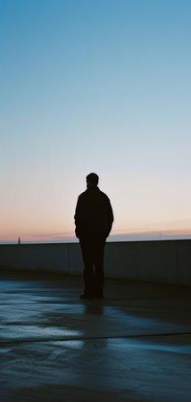 A man stands alone on a rocky surface, his silhouette sharply defined against a bright backdrop, suggesting a moment of deep contemplation and reflection at twilight or dawn.