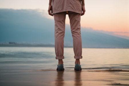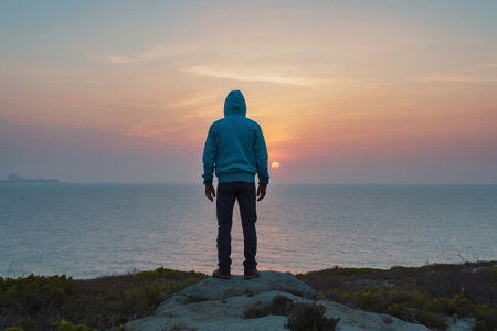 Rear view of casual woman contemplating scenic sunset over calm ocean, feeling serene and inspired by nature's beauty