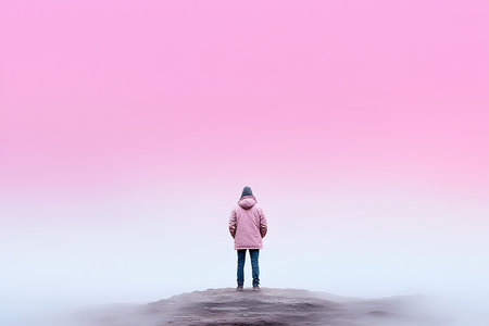 A lone figure stands on a rocky outcrop, gazing at an ethereal pink sky, shrouded in soft mist. This serene scene evokes feelings of solitude and contemplation, inviting viewers to reflect on personal journeys.