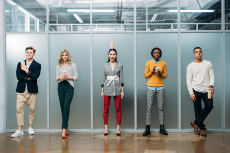 Group of businesspeople standing in a row in an office together. Five business professionals standing using technology and standing in a waiting room together in an office