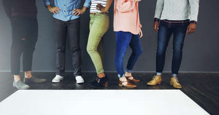 Cropped shot of the legs of young unrecognizable stylish people in smart casual clothes people who are standing in a row. Variety of stylish young people stand in bright spacious room with sunlight.