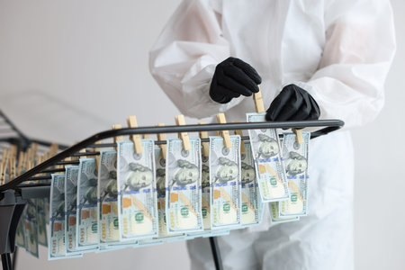 Money laundering. Woman hanging banknotes on drying rack indoors, closeup