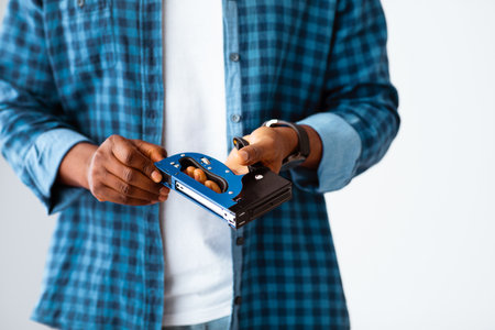 Unrecognizable black carpenter holding construction stapler in hands, standing over white background, crop