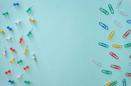 Top view group of paper pins and clips on table