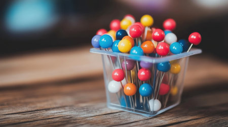 Close-up of colorful push pins in a clear container sitting on a wooden table
