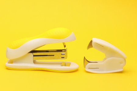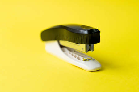 metal black stapler with braces nearby lying on a yellow background . concept of office chancery. free space for text
