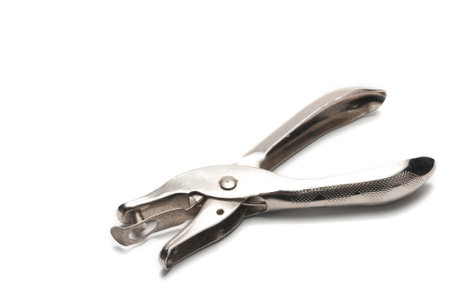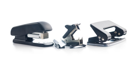 Office equipment. Stapler, staple remover and hole puncher isolated on a white background.
