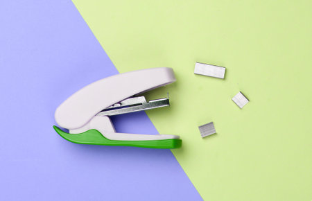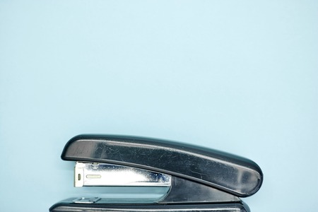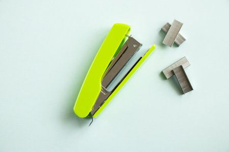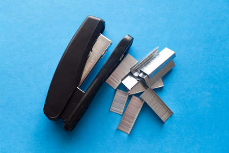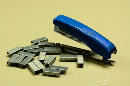 Stapler with paper clips on a blue-yellow pastel background. Minimalism. Top view