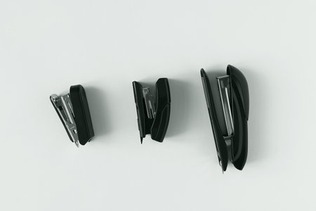 A black stapler sits elegantly against a soft, muted background, embodying minimalist design. This image captures the essence of office essentials, ideal for themes related to productivity and organization.