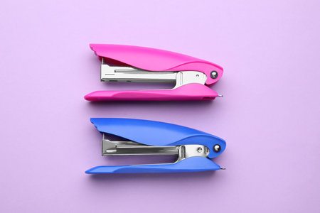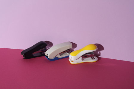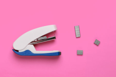 Stapler with paper clips on a blue-pink pastel background. Minimalism. Top view
