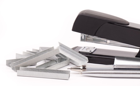 Staples along with stapler in the background. Shallow depth of field used, all isolated on a white background.