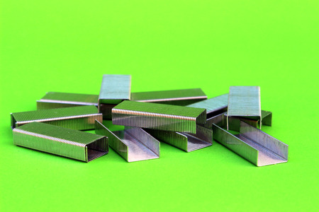 Metal staples on green background