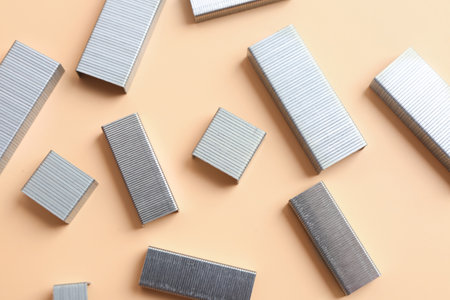 Metal staples on color background