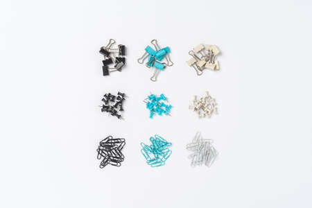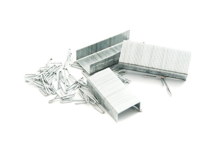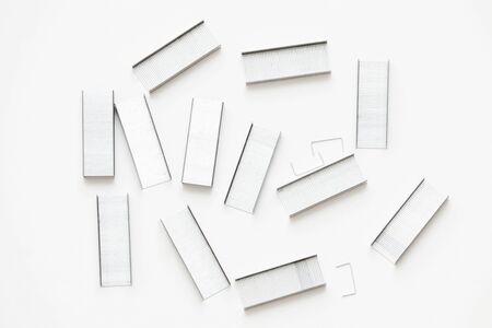 Staples from a stapler on a white background. Isolate of a bunch of staples scattered on the surface