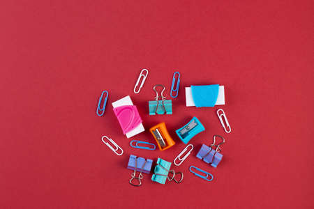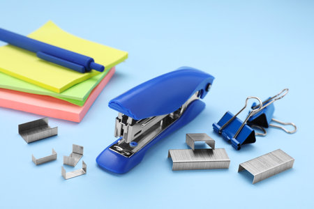 Stapler with paper clips on a blue-pink pastel background. Minimalism. Top view