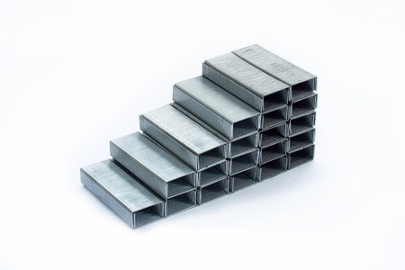 metal staples put to staircase shaped on the white fabric floor. concept of the way to success.