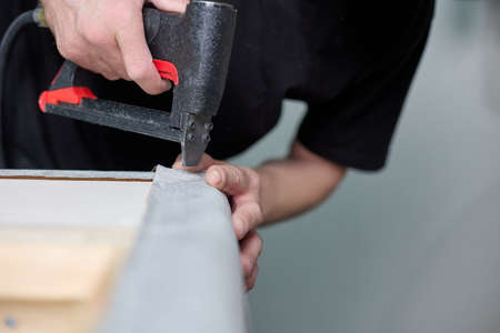Production of upholstered cabinet furniture. Worker qualitatively fixes the fabric with a pneumatic stapler on the body in the factory shop.