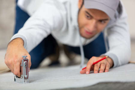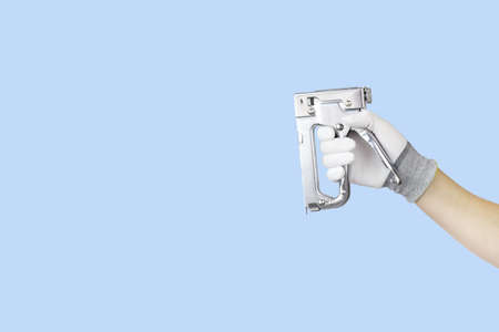 Gloved hands holding stapler construction tools. Work tools on blue background