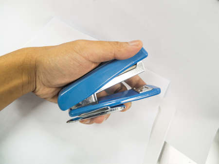 young latin woman's hand, with long fingernails, opening her fingers to grasp a paper stapler on a blue background. item used for office work and filing documents.