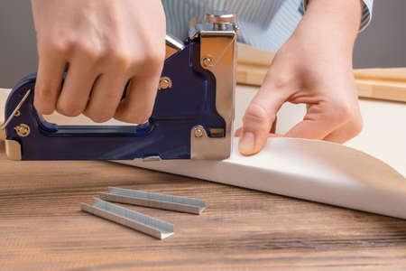 Woman using manual staple gun for replace upholstery fabric to the chair seat. Close-up