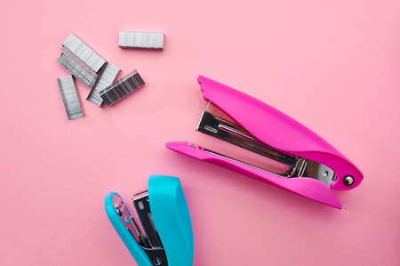 Stapler with paper clips on a blue-pink pastel background. Minimalism. Top view