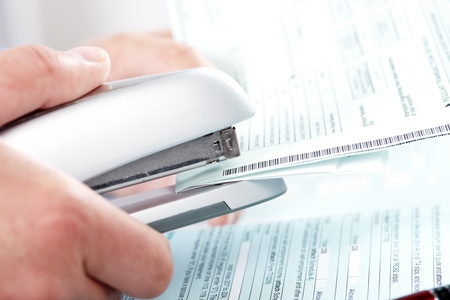 A detailed close-up view of a stapler in action, pressing multiple sheets of paper in a bright office environment, showcasing a dynamic moment of binding documents.