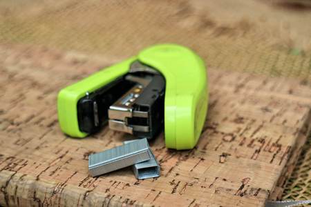 Carpentry stapler / Construction machinery held stapler on wooden background