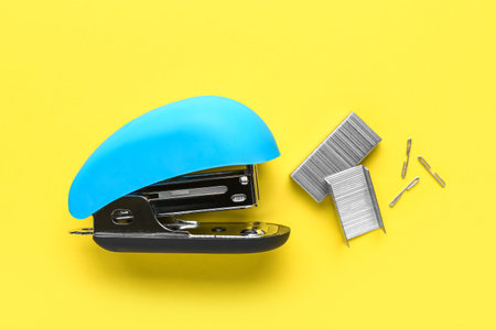 Blue stapler on a yellow background. Office supplies, stationery for school and schoolchildren. Place for your text.