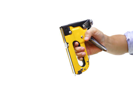Hand holding a heavy duty staple gun in use with wood work isolated on white